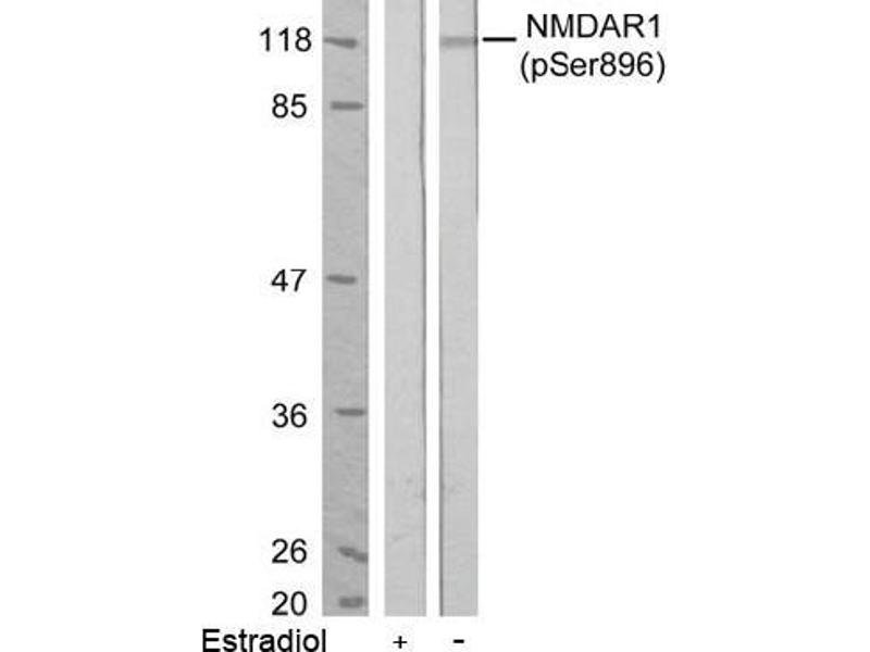 The antibody was affinity-purified from rabbit antiserum by affinity-chromatography using epitope-specific phosphopeptide. The antibody against non-phosphopeptide was removed by chromatography using non-phosphopeptide corresponding to the phosphorylation site. NMDAR1 (phospho-Ser896) antibody detects endogenous levels of NMDAR1 only when phosphorylated at serine 896.
