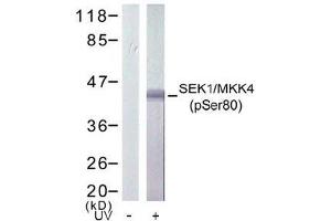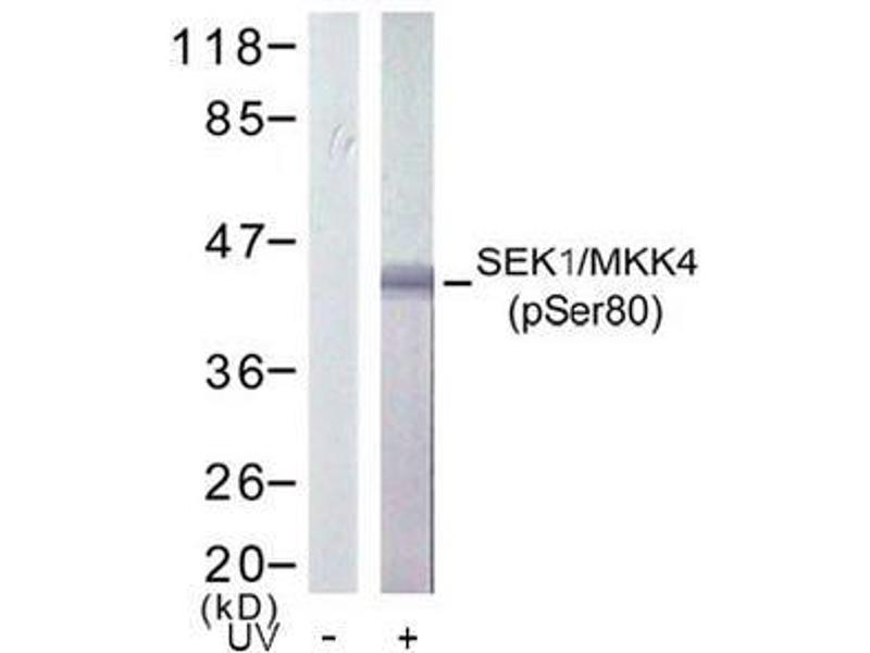 SEK1/MKK4 (phospho-Ser80) antibody detects endogenous levels of SEK1/MKK4 only when phosphorylated at Serine 80.