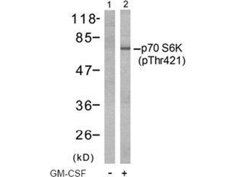 This antibody detects endogenous levels of p70 S6 Kinase only when phosphorylated at threonine 421.