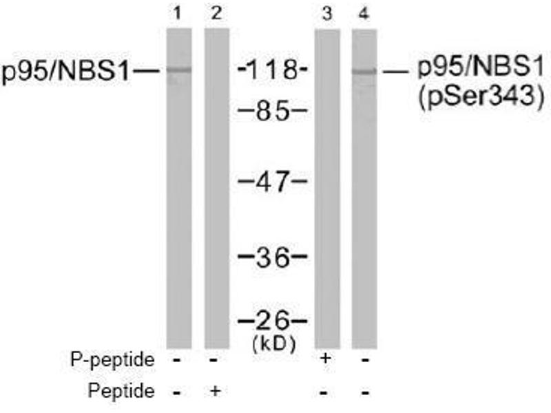 The antiserum was produced against synthesized non-phosphopeptide derived from human p95/NBS1 around the phosphorylation site of Serine 343 (S-L-SP-Q-G).