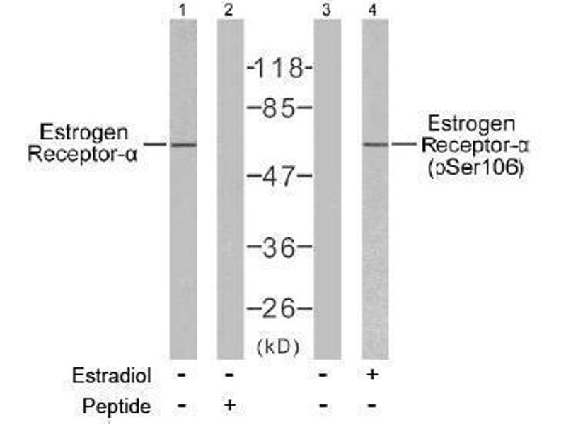 The antiserum was produced against synthesized non-phosphopeptide derived from human Estrogen Receptor-alpha around the phosphorylation site of serine 106 (S-P- SP-P-L).