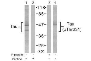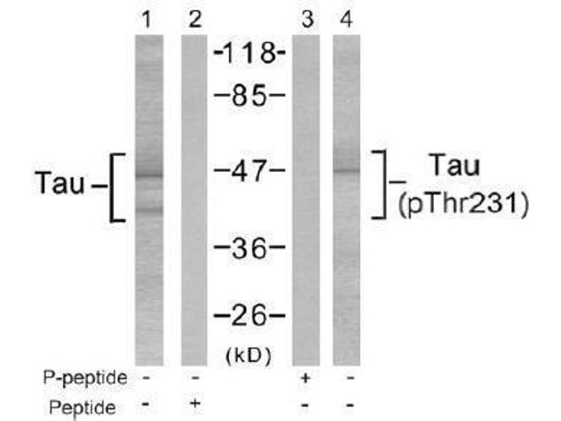 The antiserum was produced against synthesized non-phosphopeptide derived from Human Tau around the phosphorylation site of threonine 231 (V-R-Tp-P-P).