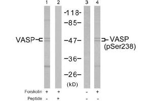 The antiserum was produced against synthesized non-phosphopeptide derived from human VASP around the phosphorylation site of serine 238 (K-V-Sp-K-Q).