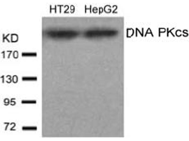 DNA PK is the key component of the non-homologous end-joining (NHEJ) pathway of DSB repair in mammalian cells. DNA PK consists of a heterodimeric DNA-binding subunit (Ku70/80) and an approximately 465 kDa catalytic subunit (DNA PKcs). DNA PKcs is a serine/threonine protein kinase whose activity is greatly stimulated by its recruitment to DNA breaks by the Ku heterodimer.Synonyms: DNA-dependent protein kinase catalytic subunit, DNPK1, HYRC, HYRC1, p460