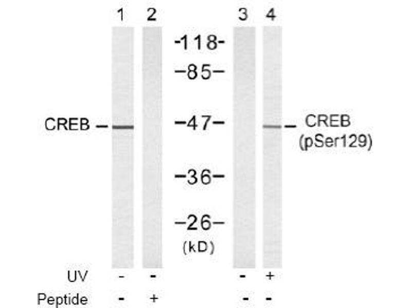 Cyclic AMP Response Element Binding protein (CREB) is a basic / leucine zipper transcription factor that binds the cyclic AMP response element (CRE) and activates transcription in response to a variety of extracellular signals including neurotransmitters, hormones, membrane depolarization, and growth and neurotrophic factors. Activation of CREB is dependent upon the phosphorylation of serine 133. Phosphorylation occurs via p44 / 42 MAP kinase and p90RSK and also via p38 MAP kinase and MSK 1. Although CREB will bind DNA independent of its phosphorylation state, only the phosphorylated form is competent as a transcription factor. CREB binding protein (CBP), a transcriptional coactivator that directly interacts with CREB, binds to CREB in the region of serine 133. CREB appears to play an important role in learning and memory. CREB knock out mice show diminished learning ability.Synonyms: CREB-1, Cyclic AMP-responsive element-binding protein 1, cAMP-responsive element-binding protein 1