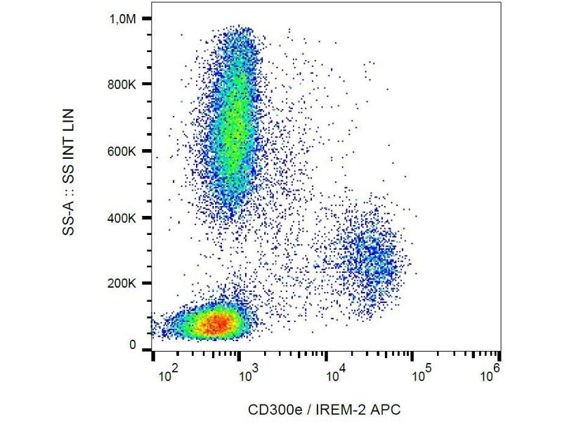 The mouse monoclonal antibody UP-H2 recognizes an extracellular epitope on CD300e / IREM-2, a 32 kDa glycoprotein expressed by mature monocytes and peripheral blood myeloid dendritic cells.