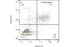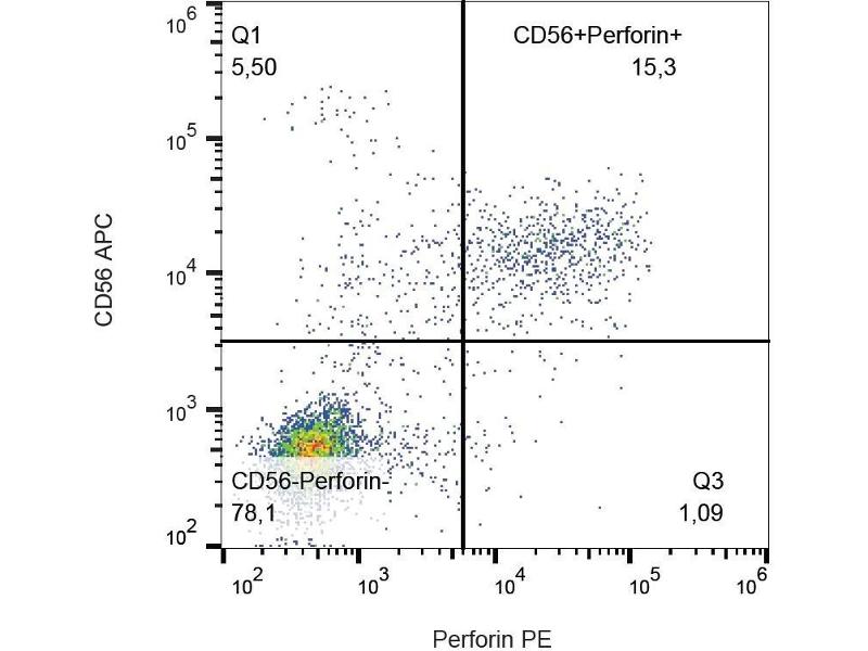 The mouse monoclonal antibody dG9 (also known as deltaG9) recognizes perforin, a 70 kDa protein expressed in cytoplasmic granules of cytotoxic T cells and NK cells.