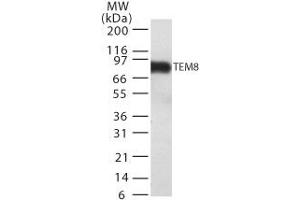 - TEM8 is observed at ~80 kD in western blots of HUVEC cells (Hotchkiss et al, 2005) and as an 80 kD and 85 kD double in human colon cell lysates (Nanada et al, 2004). The size difference is thought to be due to glycosylation as a 70 kD band was seen when cell extracts in Nanda et al (2004) were treated with a glycosidase cocktail. Nanda et al (2004) note a passage dependent loss of TEM8 in HUVEC suggesting that that TEM8 may be a specific marker of the endothelial cell (EC) phenotype which is lost as primary EC's age in culture and de-differentiate.