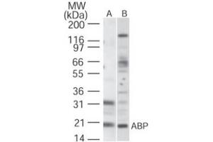 - Amino acids 11-28 (LQTKQRRPSKDKIEDELE)of human ABP protein were used as the immunogen. Percent identity by BLAST analysis: Human, Gorilla, Gibbon, Marmoset, Mouse, Bovine, Pig, Chicken (100%), Rat, Rabbit (94%), Stickleback (83%).