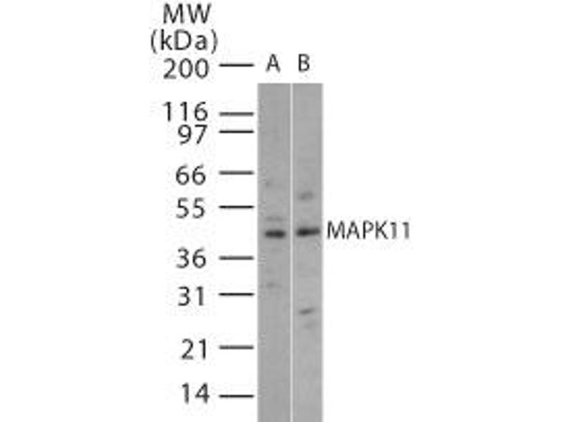 A synthetic peptide corresponding to amino acids 39-59of human MAPK11 (CSAYDARLRQKVAVK), GenBank no. gi|20128774|ref|NP_002742.3|. This peptide sequence is 100% conserved in mouse and rat. Percent identity by BLAST analysis: Human, Monkey, Marmoset, Mouse, Rat, Horse (100%), Gorilla, Gibbon, Hamster, Panda, Zebrafish (93%), Bovine (87%), Opossum, Chicken, Xenopus, Stickleback, Pufferfish (80%).