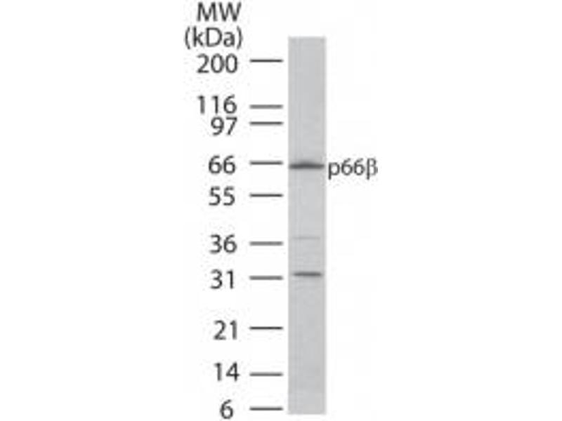 This antibody was developed against a synthetic peptide corresponding to aa 445-460(CMTSNQKKALKAEHTN)of mouse p66 b. It cross-reacts with human p66 b. Percent identity by BLAST analysis: Human, Gorilla, Gibbon, Monkey, Marmoset, Mouse, Rat, Bovine, Dog, Bat, Hamster, Elephant, Panda, Horse, Rabbit, Pig, Opossum, Turkey, Chicken, Platypus, Xenopus, Pufferfish, Zebrafish, Stickleback (100%), Drosophila, Mosquito (88%), Water flea, Ant (81%).