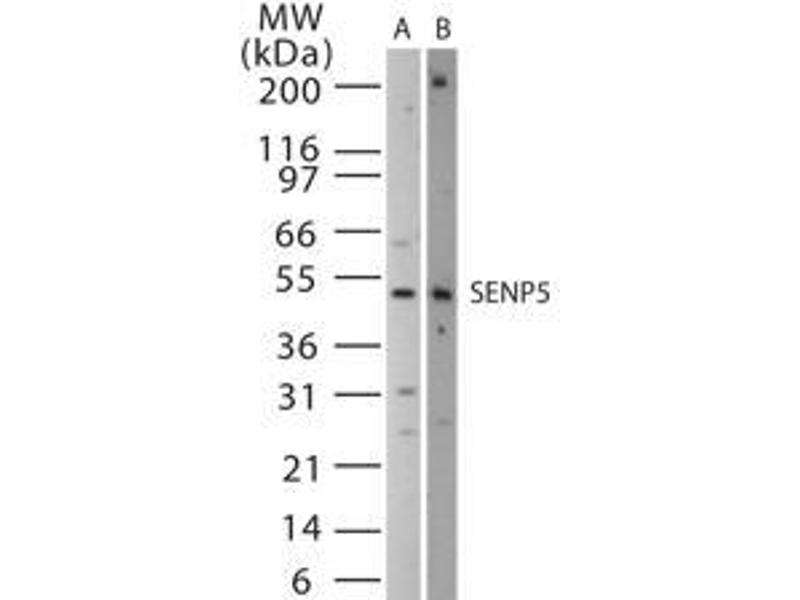This antibody was developed against a synthetic peptide corresponding to amino acids 229-246 (C-NRKPFINREITNYRARH) of human SENP5. It will cross-react with mouse SENP5. Percent identity by BLAST analysis: Human, Gorilla, Gibbon, Monkey, Marmoset, Mouse, Rat, Dog, Bovine, Hamster, Elephant, Panda, Horse, Rabbit, Pig, Opossum, Platypus (100%), Bat (94%).