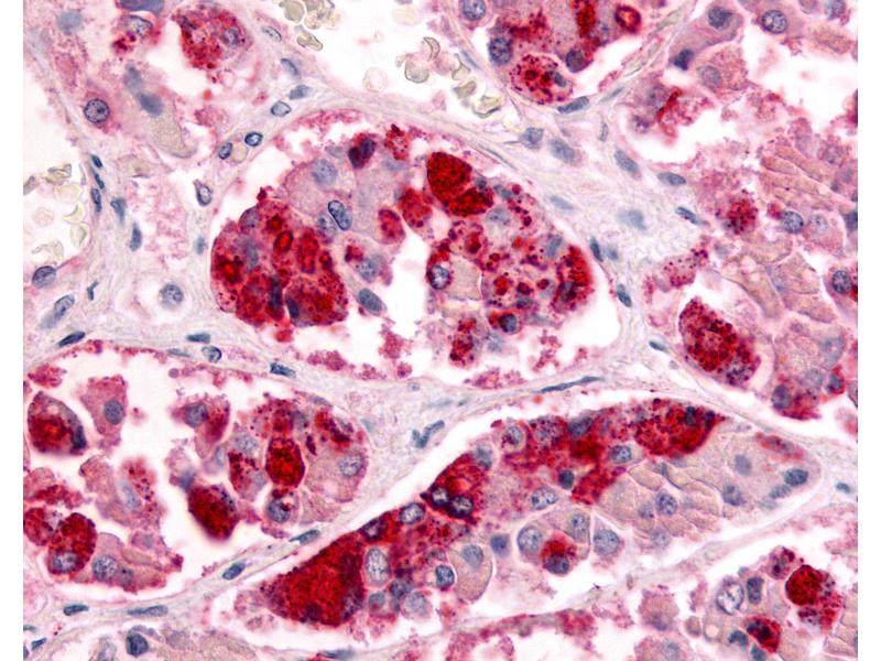 Usage: Immunohistochemistry: This antibody was validated for use in immunohistochemistry on a panel of 21 formalin-fixed, paraffin-embedded (FFPE) human tissues after heat induced antigen retrieval in pH 6.0 citrate buffer. After incubation with the primary antibody, slides were incubated with biotinylated secondary antibody, followed by alkaline phosphatase-streptavidin and chromogen. The stained slides were evaluated by a pathologist to confirm staining specificity. The optimal working concentration for this antibody was determined to be 5 μg/mL. -