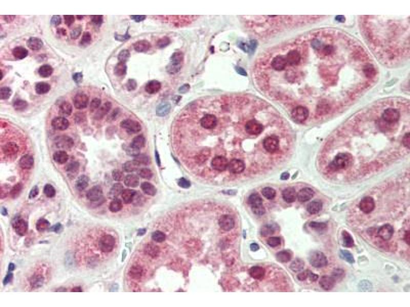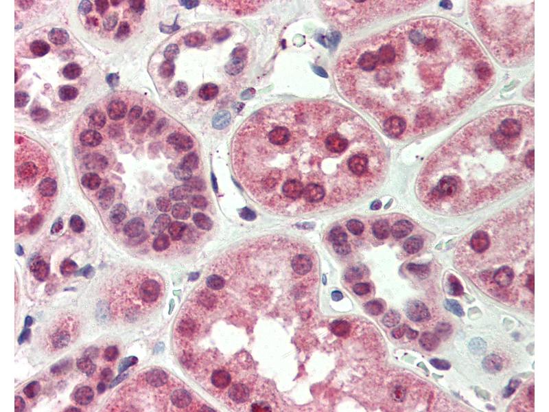 Usage: Immunohistochemistry: This antibody was validated for use in immunohistochemistry on a panel of 21 formalin-fixed, paraffin-embedded (FFPE) human tissues after heat induced antigen retrieval in pH 6.0 citrate buffer. After incubation with the primary antibody, slides were incubated with biotinylated secondary antibody, followed by alkaline phosphatase-streptavidin and chromogen. The stained slides were evaluated by a pathologist to confirm staining specificity. The optimal working concentration for this antibody was determined to be 5 μg/mL. -