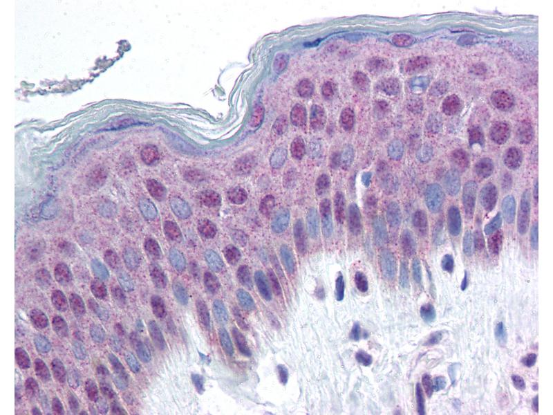 Usage: Immunohistochemistry: This antibody was validated for use in immunohistochemistry on a panel of 21 formalin-fixed, paraffin-embedded (FFPE) human tissues after heat induced antigen retrieval in pH 6.0 citrate buffer. After incubation with the primary antibody, slides were incubated with biotinylated secondary antibody, followed by alkaline phosphatase-streptavidin and chromogen. The stained slides were evaluated by a pathologist to confirm staining specificity. The optimal working concentration for this antibody was determined to be 20 μg/mL. -