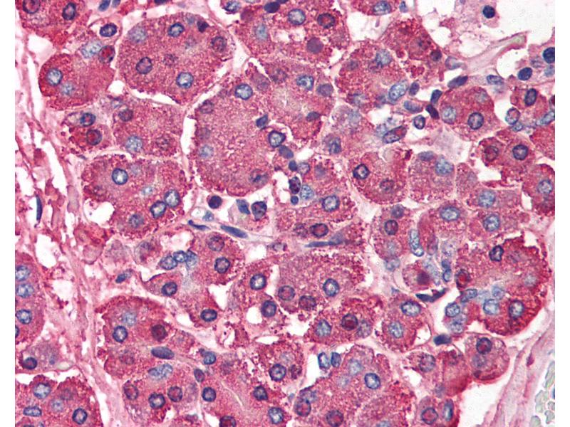 Usage: Immunohistochemistry: This antibody was validated for use in immunohistochemistry on a panel of 21 formalin-fixed, paraffin-embedded (FFPE) human tissues after heat induced antigen retrieval in pH 6.0 citrate buffer. After incubation with the primary antibody, slides were incubated with biotinylated secondary antibody, followed by alkaline phosphatase-streptavidin and chromogen. The stained slides were evaluated by a pathologist to confirm staining specificity. The optimal working concentration for this antibody was determined to be 2.5 μg/mL. -