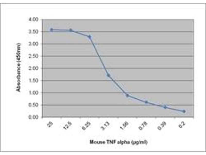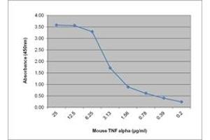 - Recognizes mouse tumor necrosis factor alpha (TNF alpha), also known as TNFSF2. This 17kD cytokine is produced by monocytes, macrophages, neutrophils, NK cells and CD4+ T cells. TNF alpha forms dimers and trimers, and is also found as a 26kD integral membrane protein. Mouse TNF alpha has cytolytic activity against many tumor cell lines, and has an important immunoregulatory role. Is reported to neutralize the effects of mouse TNF alpha.