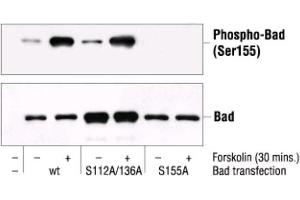 - Detects overexpressed levels of Bad only when phosphorylated at Ser155. Does not detect Bad phosphorylated at other sites or related family members. Species cross-reactivity: Human.