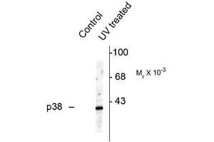 - Specific for the ~39k p38 MAPK protein phosphorylated at Thr180/Tyr182. Immunolabeling is blocked by preadsorption of the antibody with the phosphopeptide used as antigen but not by the corresponding dephosphopeptide.