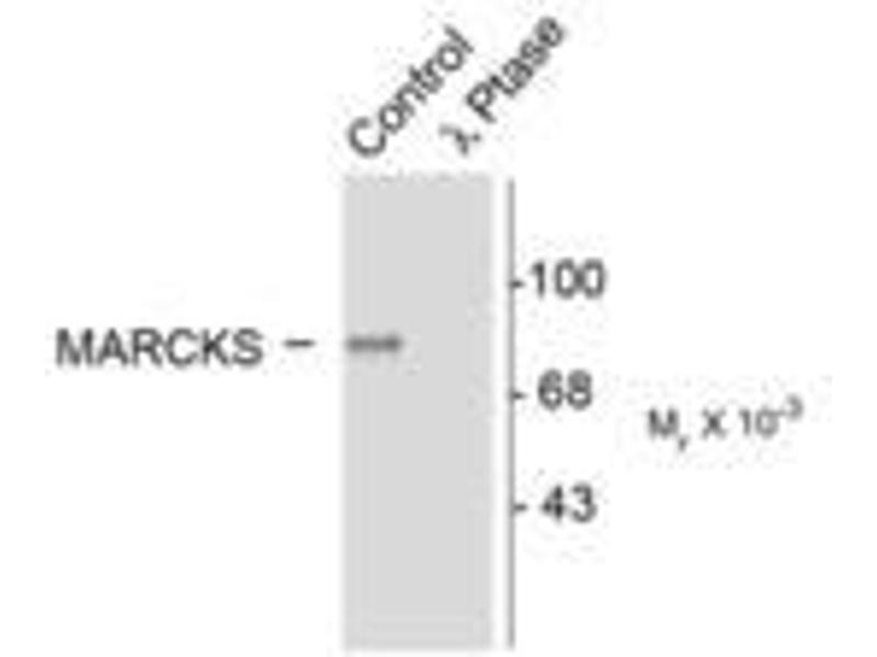 - Specific for the ~87k MARCKS protein phosphorylated at Ser152 and Ser156 in Western blots. Immunolabeling is blocked by the phosphopeptide used as the antigen but not by the corresponding dephosphopeptide. The immunolabeling is completely eliminated by X-phosphatase