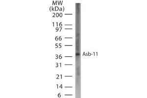 This antibody was developed against synthetic peptides corresponding to amino acids 40-51 (IVKGNRKEAARI)and 250-265 (YGANLKRRNAQGKSAL)of human Asb-11. Percent identity by BLAST analysis: Human, Gorilla, Orangutan, Gibbon, Monkey, Marmoset, Mouse, Rat, Dog, Bat, Bovine, Hamster, Elephant, Panda, Horse, Rabbit, Pig, Opossum, Turkey, Chicken, Platypus, Lizard, Xenopus (100%), Pufferfish, Zebrafish, Stickleback (92%).