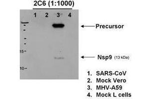 This antibody has been tested for use in immunofluorescence microscopy and western blotting. Specific conditions for reactivity should be optimized by the end user. Expect a band approximately 13 kDa in size corresponding to mature MHV-A59 nsp9 by western blotting in the appropriate cell lysate or extract. For immunofluorescence microscopy, Vero-E6 cells were grown on glass slides followed by infection with MHV-A59 strain and fixation with PBS/3%PFA. After washing and permeabilization of the fixed cells, antibody incubation was performed in PBS/5%FCS for 30 min.