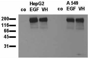 Immunoblotting: 0.1 µg/mL for HRP/ECL detection. Recommended blocking buffer CPPT: 0.5 % (w/v) casein, 5 % (w/v) PEG 4000, 5 % (w/v) Polyvinylpyrrolidone (PVP), 0.5 % Tween 20, 10mM Tris/HCl, pH 7.4, 150mM Sodium Chloride. Phosphospecificity Whole cell extracts of control (co), EGF stimulated (EGF) or pervanadate treated (VH) HepG2 and A549 tumor cells were applied to SDS-PAGE (20.000 cells per lane) and transferred to a PVDF membrane. The blot was probed with 0.5- g/mL ABIN235076 for 1 hour at RT and developed by ECL (exp. time: 30 sec). ELISA: 0.1 µg/mL Each laboratory should determine an optimum working titer for use in its particular application. Other applications have not been tested but use in such assays should not necessarily be excluded.