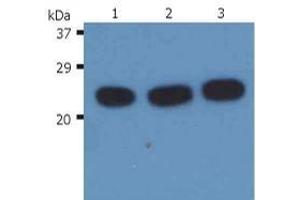 ELISA. Western Blotting under Reducing conditions (0.5-1 μg/mL): Positive control: RAJI human Burkitt lymphoma cell lineHeLa human cervix carcinoma cell lineK567 human leukemia cell lineSample preparation: Resuspend approx.50 mil. cells in 1 mLcold Lysis buffer (1 % laurylmaltoside in 20 mM Tris/Cl, 100 mM NaCl pH 8.2, 50 mM NaF including Proteaseinhibitor Cocktail). Incubate 60 min on ice. Centrifuge to remove cell debris. Mix lysatewith reducing Laemmli SDS-PAGE sample buffer. Boil for 5 min. Other applications not tested. Optimal dilutions are dependent on conditions and should be determined by the user.
