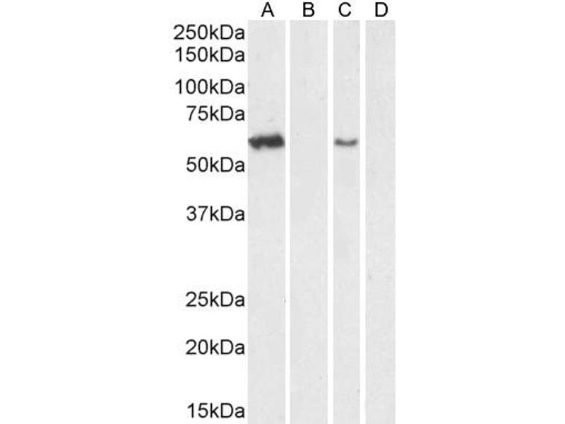 Western Blot: Approx 60-65Da band observed in Mouse and Rat Testis lysates (calculated MW of 53.7 kDa according to Mouse NP_033843.2 and Rat NP_001030105.2,). This molecular weight is routinely observed by other sources and was successfully blocked by inc