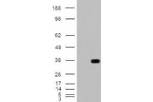 Western Blot: Approx. 33 kDa band observed in Human Heart, Muscle and Kidney lysates (calculated MW of 34.3 kDa according to NP_005318.2). In transfected HEK293 transiently expressing HADH a band of approx. 38 kDa is observed. This band is not observed in t