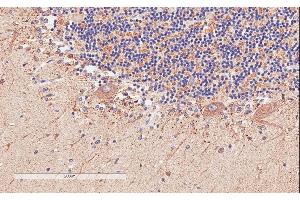 Immunohistochemistry: In paraffin embedded Human Cerebellum shows pixulated cytoplasm staining in neurons directly near the granular layer. Recommended concentration: 2-4 μg/mL.