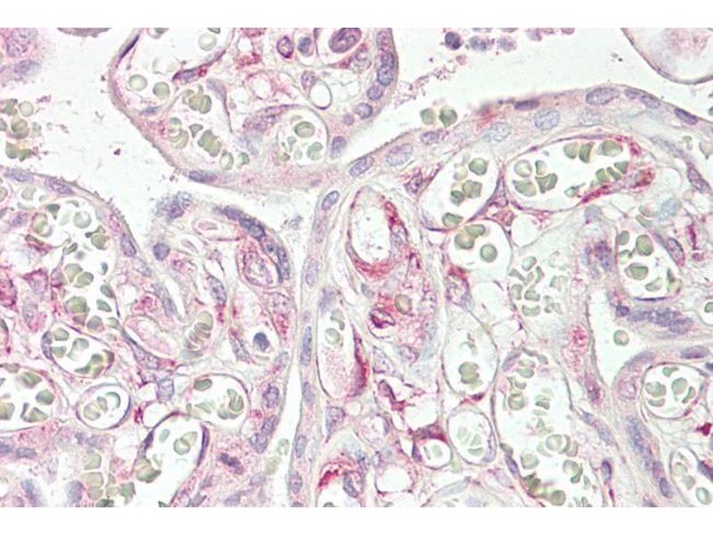 Immunohistochemistry: Paraffin embedded Human Placenta. Recommended concentration: 3.75 μg/mL.