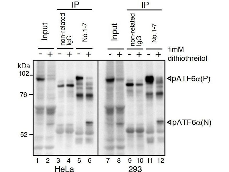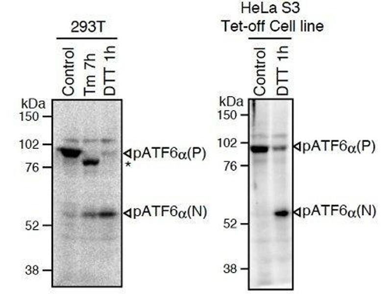ATF6 (activating transcription factor 6) is an endoplasmic reticulum (ER) membrane-bound transcription factor activated in response to ER stress. When unfolded proteins accumulate in the ER, ATF6 is cleaved by regulated intramembrane proteolysis. The resulting amino-terminal fragment translocates to the nucleus and activates transcription by binding to ER stress-response elements present in the promoter regions of ER stress-inducible genes including those encoding ER chaperones and components of ER-associated degradation. The mammalian ATF6 family consists of two closely related homologs, ATF6alpha and ATF6beta. ATF6alpha but not ATF6beta plays a pivotal role in transcriptional control. The monoclonal antibody was characterized in the laboratory of Professor Kazutoshi Mori of Kyoto University.