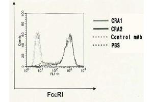 FcεR1alpha is subunit of the high affinity receptor for IgE to which IgE directly binds. FcεR1 is a tetrameric complex consisting of one alpha, one beta and two γ subunits. The latter two are required for signal transduction activity. The FcεR1 complex plays an important role in triggering allergic responses. The CRA1 (AER37) monoclonal antibody reacts with the FcεR1alpha subunit on a region that does not overlap the region of the IgE binding site, thus it does not compete with IgE for the receptor binding. Since the CRA2 (AER24) monoclonal antibody reacts with the IgE binding site on FcεR1alpha, it competes with IgE for the receptor binding. Combining the two antibodies, one can quantitatively measure the amounts of the IgE-bound FcεR1alpha.