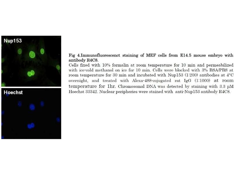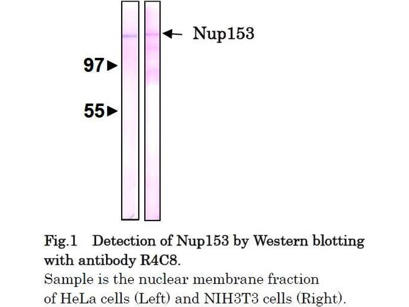 The nuclear pore complex (NPC) regulates cargo transport between the cytoplasm and the nucleus. Nup (Nucleoporin) 153 is a large (153 kDa) O-linked glycoprotein which is a component of the basket structure located on the nucleoplasmic face of NPC. Nup153 plays a critical role in nuclear export of RNA and proteins. The antibody was purified from the serum-free cultured medium of the hybridoma under mild conditions by propriety chromatography processes.