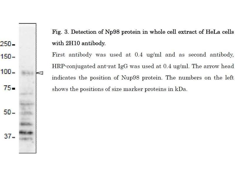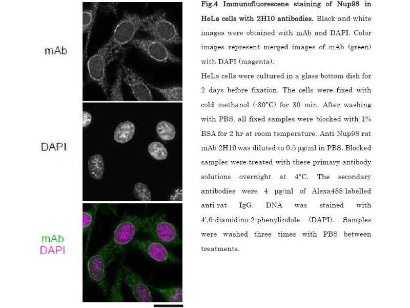 Nucleoporin 98 (Nup98) is a component of nuclear pore complex (NPC), which is a large protein assembly embedded in the nuclear envelope. It is localized on both nuclear and cytoplasmic side of NPC. This protein contains glycine-leucine-phenylalanine-glycine (GLFG) amino acid repeats and plays a critical role in nuclear trafficking. Nup98 plays a specific role in the RNA export. Nup98 gene is fused to a variety of partner genes in human myeloid and T-cell malignancies via chromosomal translocation. This hybridoma has been established by Prof. T. Tachibana's Lab. at Osaka City Univ.