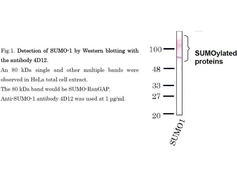 SUMO (Small Ubiquitin-like Modifier) proteins are a family of small proteins that are covalently attached to and detached from other proteins in cells to modify their function. Unlike ubiquitination, which targets proteins for degradation, SUMO modification plays a critical role in a number of cellular functions including nucleocytoplasmic transport, gene expression, cell cycle and formation of subnuclear structures such as promyelocytic leukemia (PML) bodies. There are three confirmed SUMO isoforms in human, SUMO1, SUMO2 and SUMO3. SUMO2 /3 show a high degree of similarity to each other and are distinct from SUMO1. Individual SUMO family members are all targeted to different proteins with diverse biological functions. SUMO-1 is conjugated to RanGAP, PML, p53 and IkappaB-alpha to regulate nuclear trafficking, formation of subnuclear structures, regulation of transcriptional activity and protein stability. SUMO1 is encoded as a 101 aa protein and first Met and C-terminal 4 aa are removed from the preprotein.