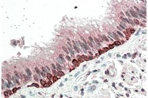 ELISA: Antibody detection limit dilution 1:4000. Western Blot: Approximately 50 kDa band in human skin lysates after 1 μg/mL antibody staining . The 50 kDa band was successfully blocked by incubation with the immunizing peptide. IHC: In paraffin embedded Human Bronchus shows strong nuclear staining in the basal cells of the resporatory epithelium. Recommended concentration, 5-10μg/mL.