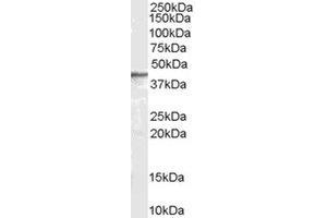 ELISA: Antibody detection limit dilution 1:32000. Western Blot: Approximately 40 kDa band observed in human brain lysates (calculated MW of 46.1 kDa according to NP_004304.1 and 44.4 according to NP_945355.1). Recommended concentration: 0.3-1 μg/mL. Immunohistochemistry: In paraffin embedded human cerebellum shows mainly nuclear staining of Purkinje cells and neuronal cells in the Molecular Layer. Recommended concentration, 4-6 μg/mL.