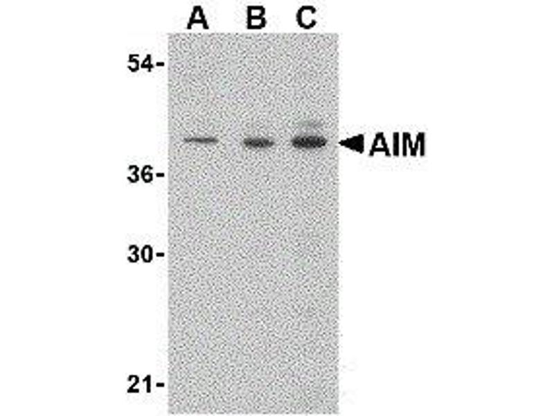 Der Kaninchen Polyklonal anti-CD5L Antikörper (ABIN2472165) detektiert spezifisch CD5L in WB und IHC (p).