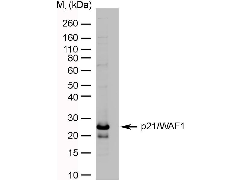 - This antibody recognises the human cyclin-dependent kinase inhibitor p21/WAF1, which is an important cell cycle regulatory protein, also known as CIP1.The p21 protein inhibits cell cycle progression at both the G1 and G2 checkpoints. The expression of p21 is inducible by a wide range of stress stimuli.This antibody detects a band of approximately 21kD in MCF-7 cell lysates following UV radiation.