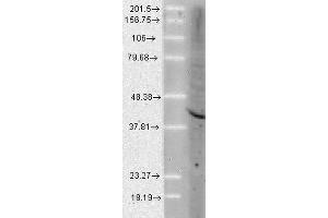 - Detects ~38 kDa. Can run up to 45 kDa on SDS Page.