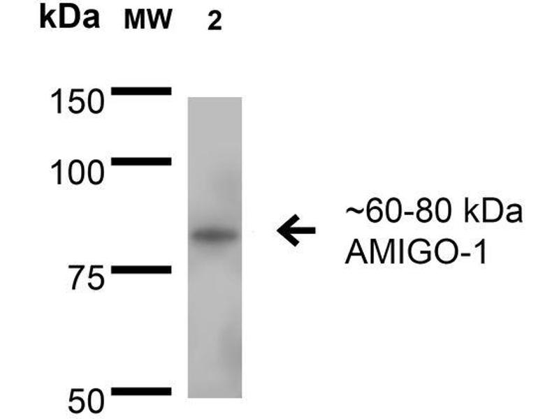 1 μg/ml of ABIN2483813 was sufficient for detection of AMIGO-1 in 20 μg of rat brain membrane lysate and assayed by colorimetric immunoblot analysis using goat anti-mouse IgG:HRP as the secondary antibody.