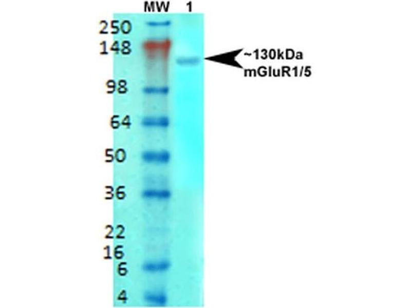 - Detects ~130 kDa (both mGluR1 and mGluR5).