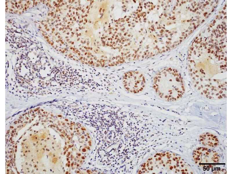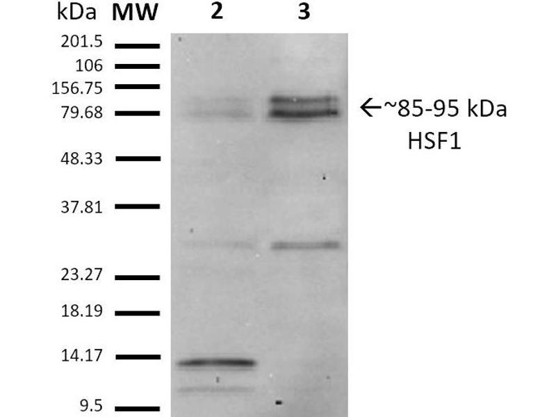1 μg/ml of ABIN2484618 was sufficient for detection of HSF1 in 20 μg of heat shocked HeLa cell lysate by ECL immunoblot analysis using Goat anti-rat IgG: HRP as the secondary antibody