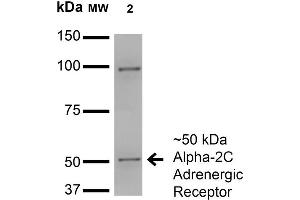 1 μg/ml of ABIN2485207 was sufficient for detection of Alpha2C Adrenergic Receptor in 20 μg of COS cells transiently transfected with HA-tagged Alpha- lysate and assayed by colorimetric immunoblot analysis using goat anti-mouse IgG:HRP as the secondary antibody.