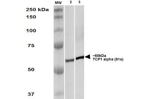 1 μg/ml of ABIN2485921 was sufficient for detection of TCP1 alpha in 20 μg of 3T3 cell lysate by colorimetric immunoblot analysis using Goat anti-rat IgG:HRP as the secondary antibody.