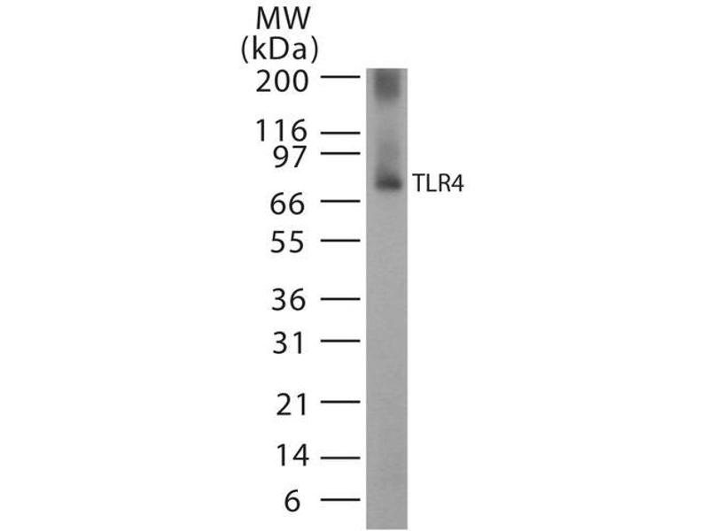 - Detects ~75-80 kDa when tested against partial recombinant mouse TLR4 (extra-cellular portion plus His-tag).