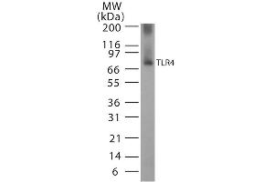 - Detects ~75-80 kDa when tested against partial recombinant mouse TLR4 (extra-cellular portion plus His-tag).