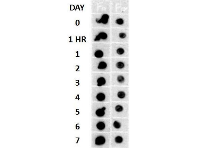 A 1:1000 dilution of ABIN2486106 was sufficient for detection of amyloid fibrils on PVDF membranes using transferred fibrils by colorimetric dot blot analysis using Goat anti-rabbit IgG:HRP as the secondary antibody.